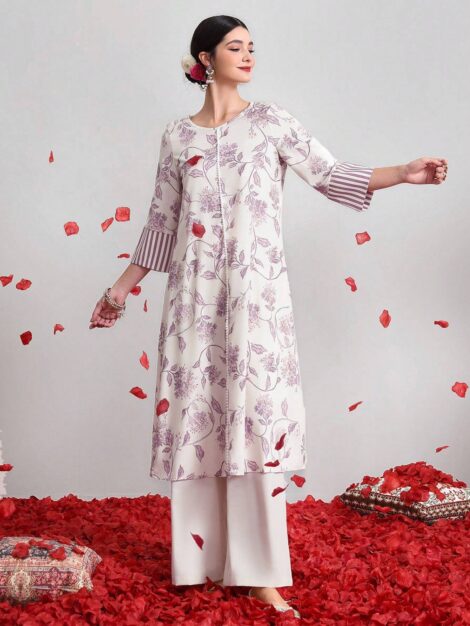 This elegant and modest grey ensemble features a sleeveless jumpsuit with floral and paisley patterns, paired with a long-sleeve tunic accented by contrast binding and batwing sleeves. Made from non-stretch woven fabric, the regular fit is perfect for late fall, offering both style and comfort.