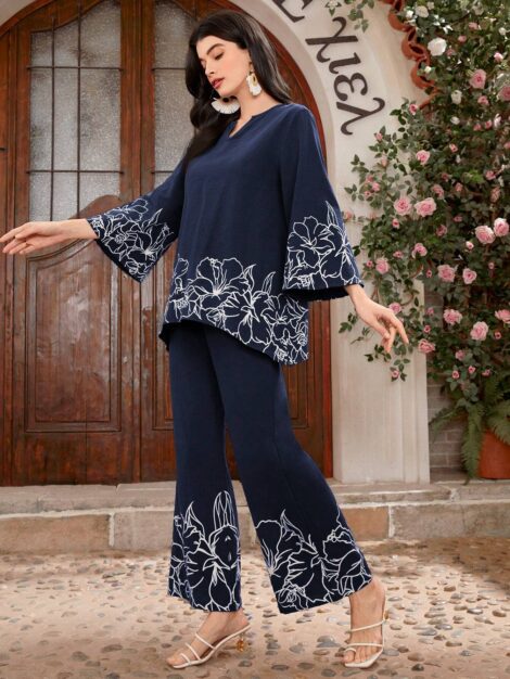 Women’s Elegant Printed Splice Batwing Sleeve Long Coat + Sleeveless Jumpsuit Set